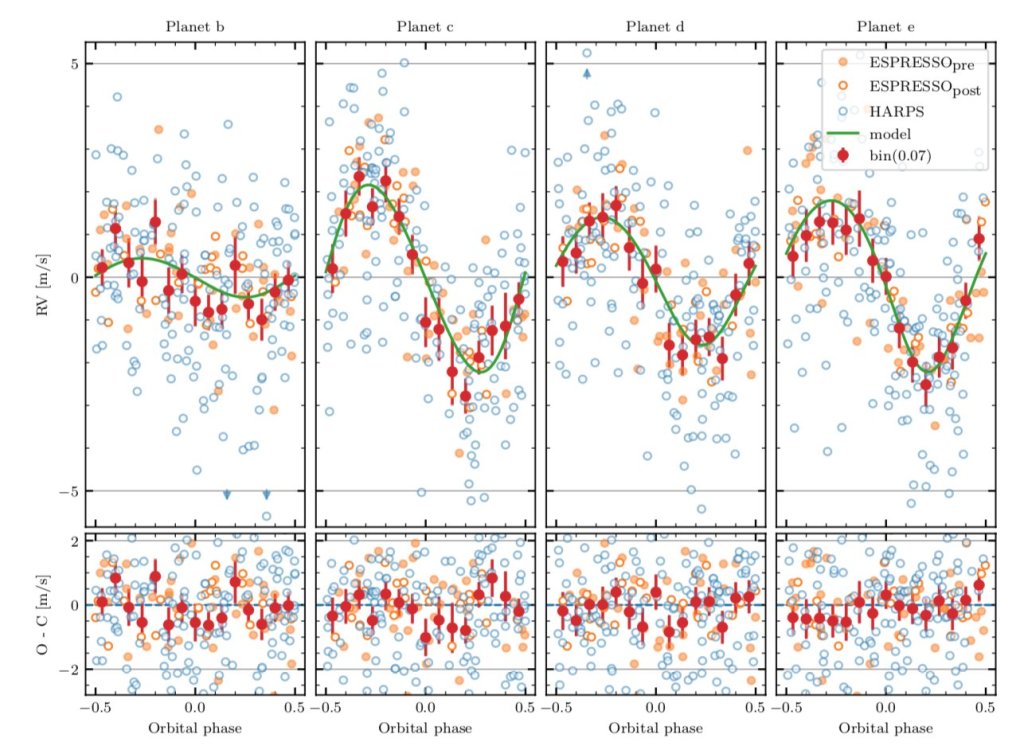 Poco a poco empezamos a ver de lo que es capaz ESPRESSO. Lo vimos primero con la rápida confirmación de Proxima b y el candidato a planeta interior en el mismo sistema. En el último artículo del GTO de ESPRESSO caracterizamos el sistema planetario de L98-59. Este sistema cuenta con 4 planetas (3 descubiertos por TESS, uno por nosotros en este trabajo) en órbitas cercanas a su estrella y un posible quinto planeta en la zona de habitabilidad. De todos estos planetas, el más notable es el planeta b, el más interior, con una masa de apenas la mitad de Venus. Esta medida marca la medida de masa más pequeña hecha nunca en velocidad radial, demostrando una vez más las posibilidades que ofrece ESPRESSO.