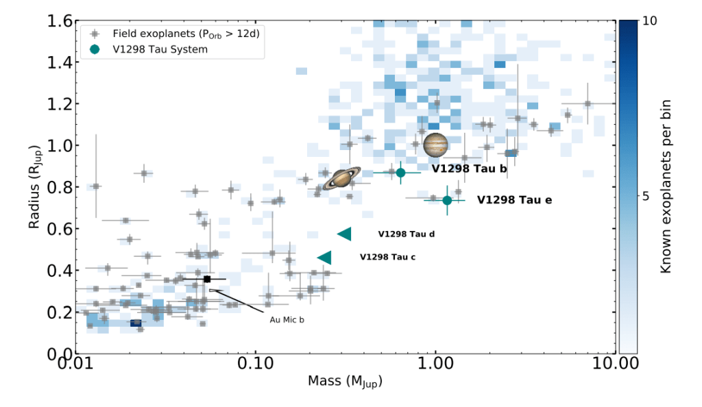 Si todo esto es correcto, parece claro que los planetas del sistema V1298 Tau no tienen una relación masa-radio diferente de los planetas del sistema solar, o de la mayoría de planetas viejos conocidos. No parece esperable tampoco que vayan a contraerse mucho más, pues esto los llevaría a una región vacía del espacio de parámetros (esquina inferior derecha en la figura superior). Con tan solo 20 millones de años, estos planetas parecen haber acabado su proceso de contracción, o al menos la mayor parte de él.
