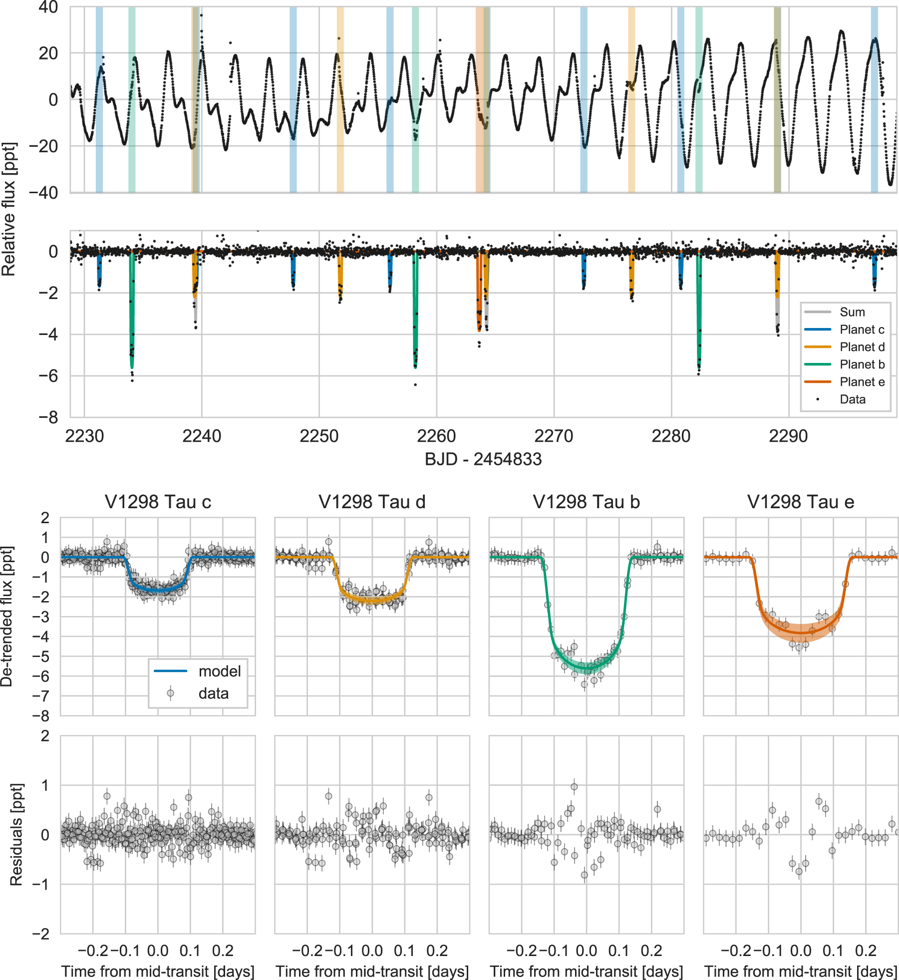 Uno de estos sistemas fue el de V1298 Tau, descubierto en 2019 por un equipo liderado por Trevor David (JPL). La estrella fue observada por el satélite Kepler, en su misión K2. En estos datos fue posible detectar la presencia de 4 planetas por medio de sus tránsitos. Dos planetas de radio similar a Neptuno, con periodos orbitales de 8 y 12 días, otro de radio similar a Júpiter, con un periodo orbital de 24 días y un cuarto de radio similar a Saturno que fue detectado con un solo tránsito y cuyo periodo se estimó entre 40 y 120 días.